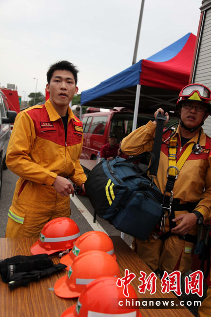 4月26日,臺灣“北二高”基隆段山崩斷橋意外第2天,大批工程人員使用近50臺怪手持續開挖,但尚未尋獲被埋的車輛和失蹤者。這起“走山”斷橋意外發生在25日,一座高百米的山坡全然崩坍,土石覆蓋道路長約200米、面積達3個足球場之大,令南下北上的交通大受影響。 圖為特種搜救隊員在現場待命。 董會峰 攝