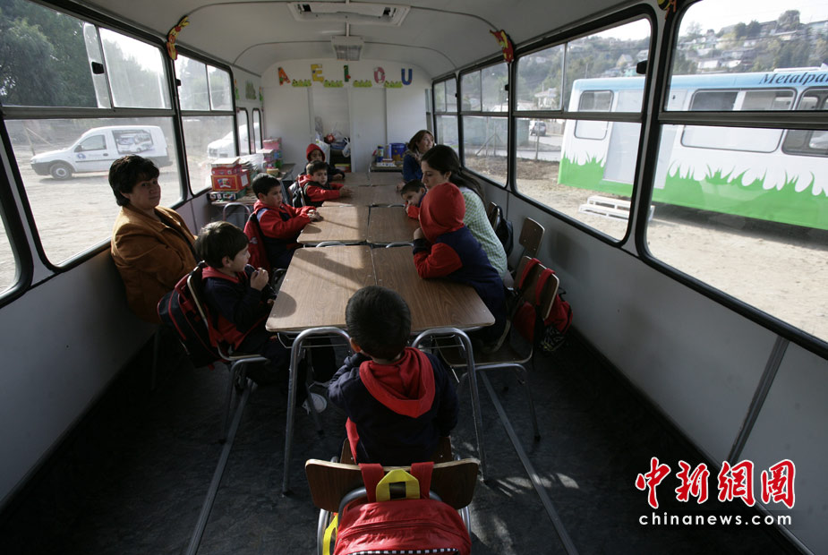 4月26日,今年2月遭受8.8級(jí)強(qiáng)烈地震的智利康塞普西翁市,兒童們?cè)凇鞍褪繉W(xué)!崩锷险n。