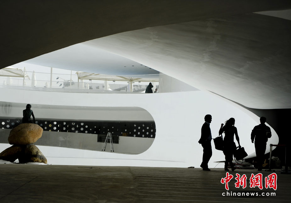 4月27日,上海世博園丹麥館,該館一位女設計師走過美人魚雕像。中新社發 廖攀 攝