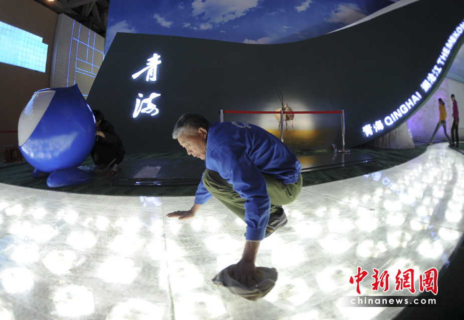 4月27日,中國省區(qū)市聯(lián)合館中的青海館,工作人員維護(hù)設(shè)施,展覽工作準(zhǔn)備就緒。中新社發(fā) 廖攀 攝