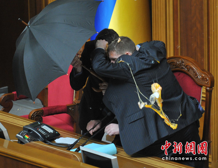 4月27日,基輔,烏克蘭議會就俄羅斯黑海艦隊駐扎問題進行討論時出現混亂,數千人在議會外示威,會場內有人投擲煙霧彈和雞蛋,大廳內煙霧彌漫,場面一度混亂。圖為議長藏在傘后躲避不斷飛來的雞蛋。