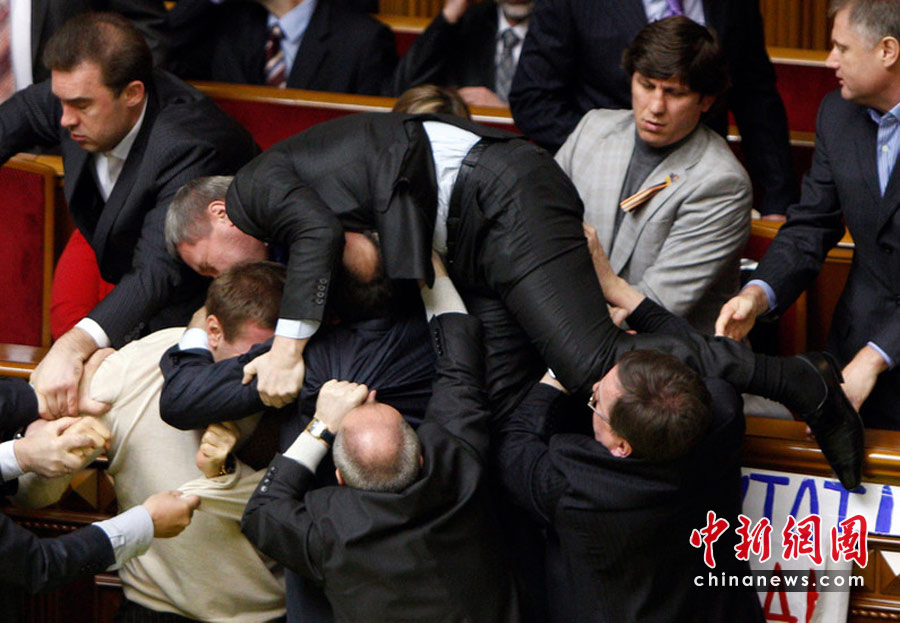 4月27日,基輔,烏克蘭議會就俄羅斯黑海艦隊駐扎問題進(jìn)行討論時出現(xiàn)混亂,數(shù)千人在議會外示威,會場內(nèi)有人投擲煙霧彈和雞蛋,大廳內(nèi)煙霧彌漫,場面一度混亂。