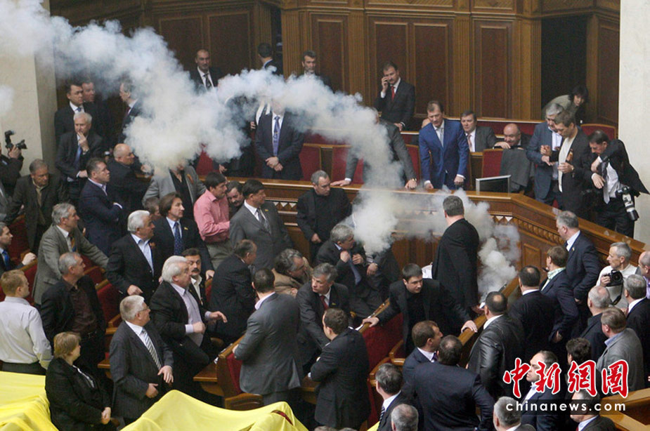 4月27日,基輔,烏克蘭議會就俄羅斯黑海艦隊駐扎問題進行討論時出現混亂,數千人在議會外示威,會場內有人投擲煙霧彈和雞蛋,大廳內煙霧彌漫,場面一度混亂。