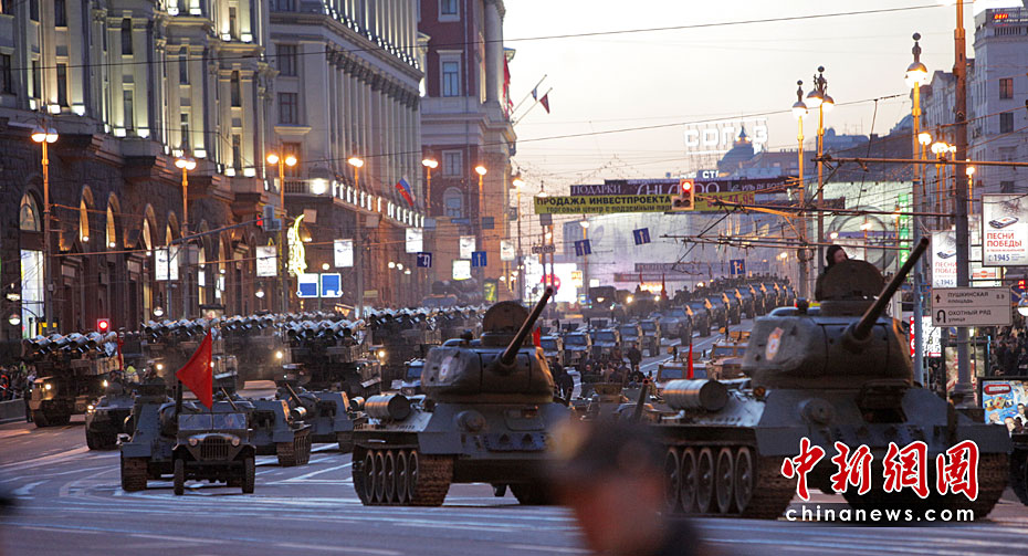 此次紅場閱兵包括兩部分內容:歷史部分和現代部分。歷史部分由身穿衛(wèi)國戰(zhàn)爭時期軍服的士兵在鵝卵石道上進行,同時還會有9輛T-34坦克和8輛SU-100自行火炮。現代部分由13輛老虎裝甲車、BTR-80裝甲車、BMP-3步兵戰(zhàn)車、T-90A坦克和S-400防空系統等。圖片來源:中國新聞網