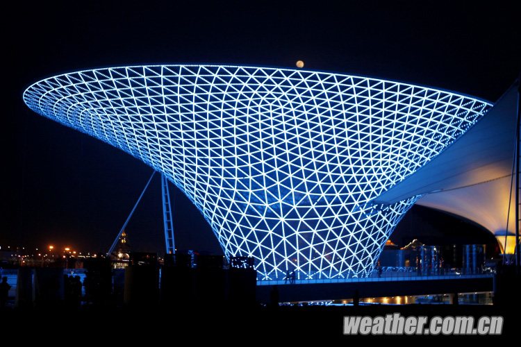 2010年4月27日,上海世博會開幕式彩排順利進行。圖為世博園內中軸線上美麗的世博。卞赟 攝