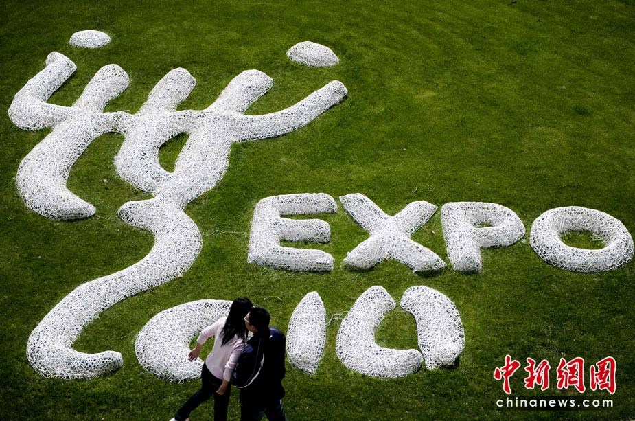 4月29日,上海靜安區(qū)草坪上的世博會會徽和一對情侶。世博會開幕前,面臨“大考”的上海充滿喜慶氣氛。 中新社發(fā) 廖攀 攝