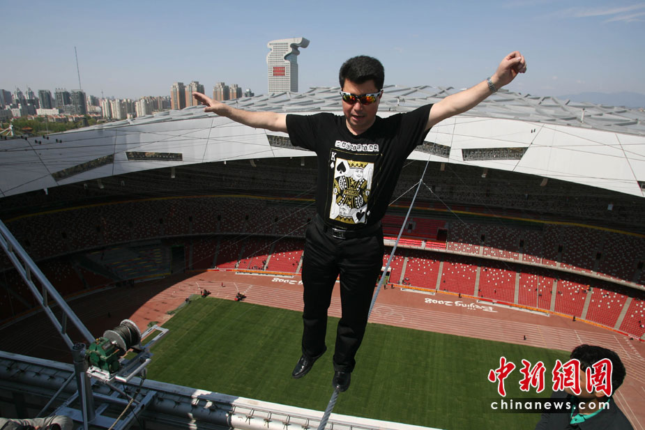 4月29日,有高空王子之稱(chēng)的新疆小伙阿迪力在鳥(niǎo)巢上空成功試演達(dá)瓦孜(高空走鋼絲)。5月3日起,他將在北京國(guó)家體育場(chǎng)(鳥(niǎo)巢)頂棚上搭建的小屋生存60天,其間每天將進(jìn)行約5個(gè)小時(shí)的高空走鋼絲表演。 中新社發(fā) 蘇丹 攝