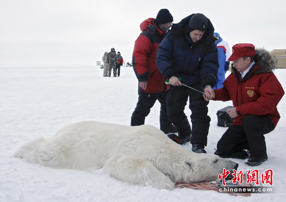 4月29日,俄羅斯總理普京參觀亞歷山大地島(法蘭士約瑟夫地群島)。 普京還與在研究學(xué)者一同給通過(guò)專門(mén)的陷阱捕獲的北極熊戴上衛(wèi)星定位項(xiàng)圈。此外,學(xué)者們還與普京一起給北極熊進(jìn)行測(cè)量和秤體重,