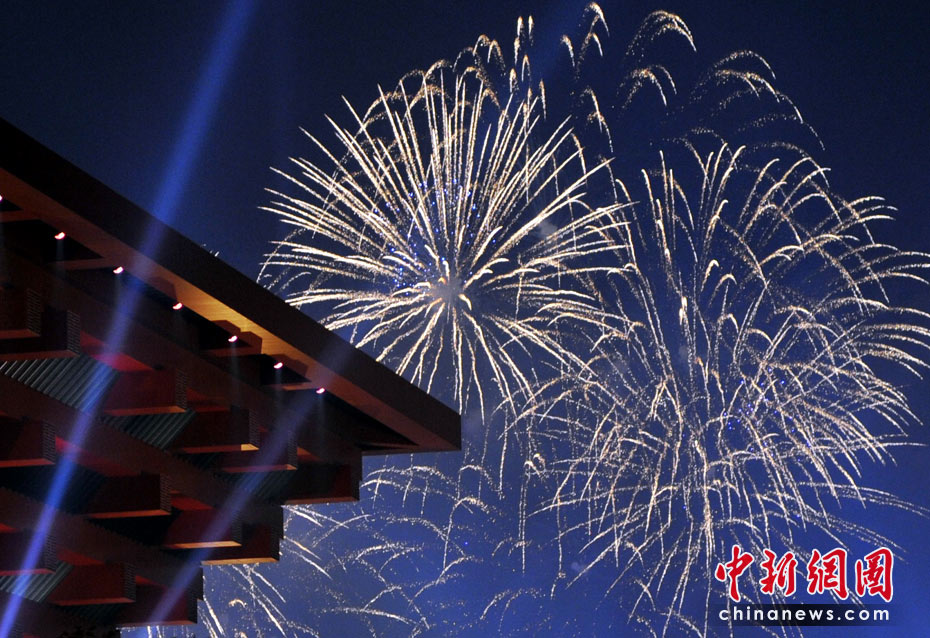 4月30日晚,2010年上海世博會開幕式在上海世博園世博文化中心舉行。21時28分,世博會焰火燈光表演開始。黃浦江兩岸綿延3.28公里同時奏響火樹銀花不夜天的華彩世博樂章。中新網記者 王紅綱 攝