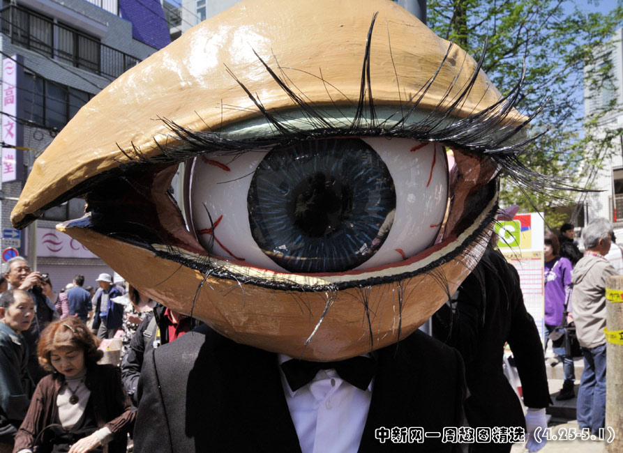 4月26日,日本一個表演藝術團體扮成“獨眼怪人”在街頭亮相,大玩行為藝術。圖片來源:中國新聞網>>點擊觀看詳細內容