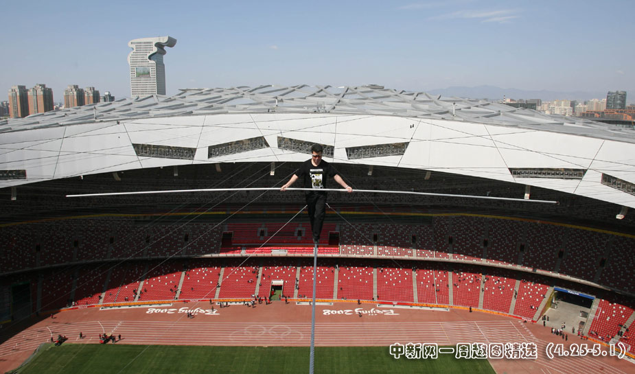 4月29日,有高空王子之稱的新疆小伙阿迪力在鳥巢上空成功試演達瓦孜(高空走鋼絲)。5月3日起,他將在北京國家體育場(鳥巢)頂棚上搭建的小屋生存60天,其間每天將進行約5個小時的高空走鋼絲表演。 圖片來源:中國新聞網>>點擊觀看詳細內容