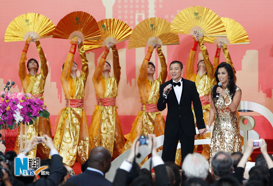5月1日,中國2010年上海世博會開園儀式在上海世博園世博中心舉行。這是劉德華(左)和韋唯在開園儀式上獻唱。 裴鑫 攝(新華網)