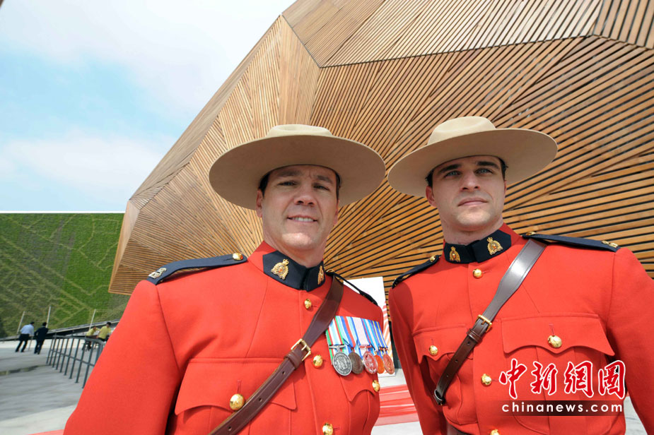 5月1日,上海世博會(huì)開幕第一天,兩名加拿大騎警在加拿大館前亮相,加拿大館于當(dāng)日上午開館。中新社發(fā) 陳文 攝