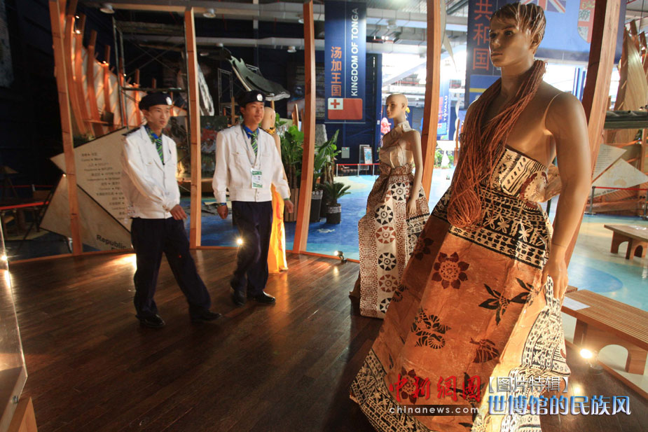 5月1日,上海世博會開園第一天,斐濟(jì)國的手繪樹皮時裝在太平洋聯(lián)合館展出。中新社發(fā) 潘索菲 攝