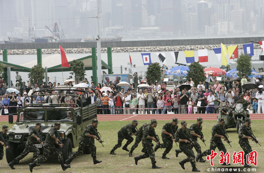 為慶!拔逡弧眹H勞動(dòng)節(jié),進(jìn)一步增進(jìn)與香港社會(huì)各界相互溝通與交流,中國人民解放軍駐香港部隊(duì)5月1日開放了昂船洲軍營,圖為“獵人戰(zhàn)斗”表演。中新社發(fā) 張勤 攝