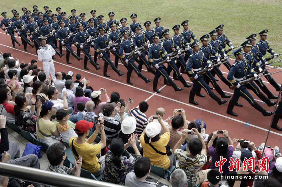 為慶祝“五一”國際勞動節(jié),進一步增進與香港社會各界相互溝通與交流,中國人民解放軍駐香港部隊5月1日開放了昂船洲軍營。圖為香港市民們爭睹駐港部隊三軍儀仗隊風(fēng)姿。中新社發(fā) 張勤 攝
