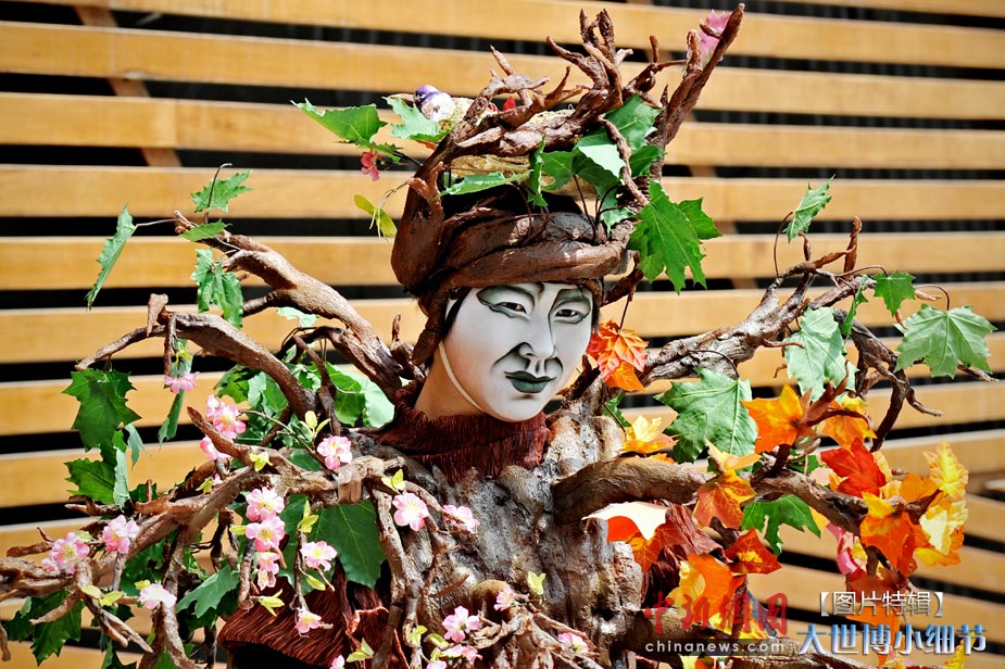 5月1日,上海世博會正式開園,當(dāng)日有20萬人次的游客參觀了世博園。世博首日,許許多多的小細(xì)節(jié)都帶給人一種全新的體驗。圖為在加拿大館一位扮作大樹的表演者。