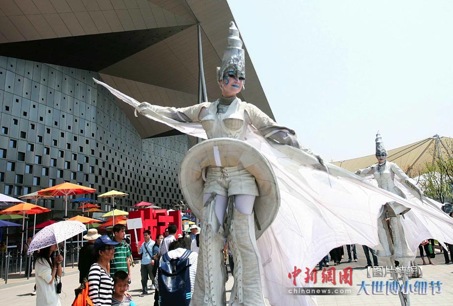 5月1日,上海世博會正式開園,當日有20萬人次的游客參觀了世博園。世博首日,許許多多的小細節都帶給人一種全新的體驗。圖為荷蘭演員在上海世博園主題館前表演長腳舞。中新社發 袁云 攝