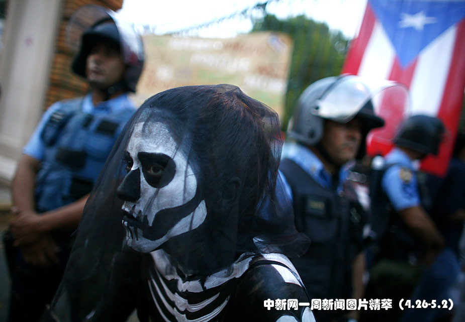 26日(周一),波多黎各,一名學生身穿怪異服飾抗議學費上漲。