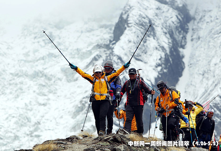 29日(周四),韓國登山運動員吳銀善在到達尼泊爾安納布爾納峰的營地后揮手歡呼。她自認是世界上首位登上世界14座最高山峰的女性。