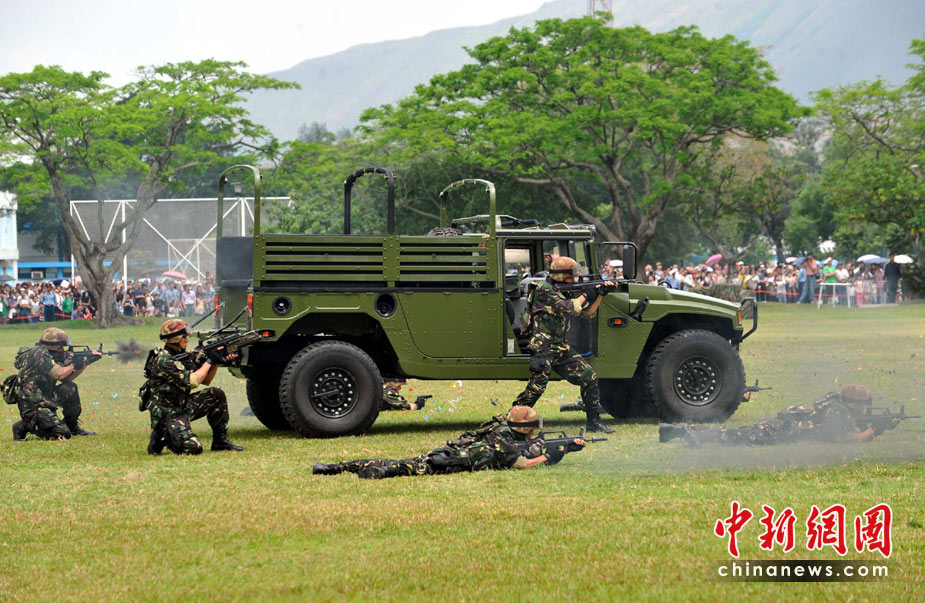 為慶祝“五一”國(guó)際勞動(dòng)節(jié),進(jìn)一步增進(jìn)與香港社會(huì)各界相互溝通與交流,中國(guó)人民解放軍駐香港部隊(duì)5月2日開放了石崗軍營(yíng)。圖為駐港部隊(duì)“獵人戰(zhàn)斗”表演。 中新社發(fā) 鄧慶樂 攝