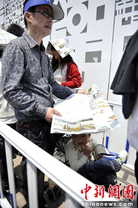 友情提示:韓國館為熱門場館,參觀游客較多,排隊(duì)時間約為2小時,請做好心理準(zhǔn)備。圖為韓國館外的排隊(duì)者中,一個父親為兒子遮陽,小家伙很愜意,父親曬的呲牙咧嘴。中新網(wǎng)記者 王紅綱 攝