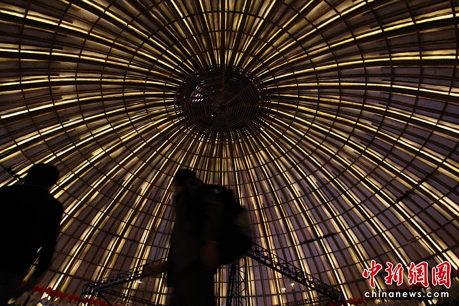 5月2日,上海世博會是第一個正式提出“低碳世博”理念的世博會,圍繞著這樣的理念,上海世博園區內的低碳元素比比皆是。圖為印度館內竹制的世界最大穹頂,這個竹制穹頂上方是小型風力發電裝置和太陽能電池板,為整個場館提供綠色清潔能源。中新社發 湯彥俊 攝