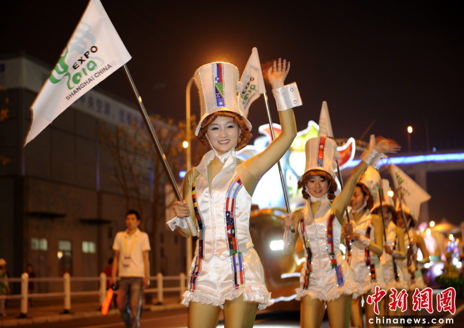 5月2日晚,由一輛輛充滿異域風情的花車和身著盛裝的表演者組成的“歡樂盛裝大巡游”在世博園區舉行。中新網記者 王紅綱 攝