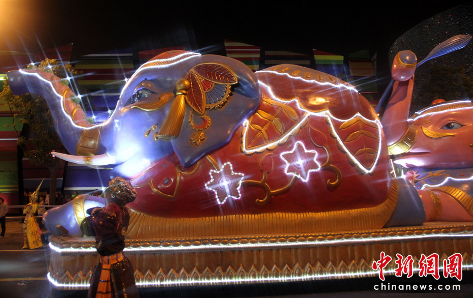 5月2日晚,由一輛輛充滿異域風情的花車和身著盛裝的表演者組成的“歡樂盛裝大巡游”在世博園區舉行。中新網記者 蘇丹 攝