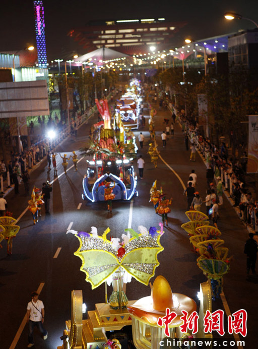 5月2日晚,由一輛輛充滿(mǎn)異域風(fēng)情的花車(chē)和身著盛裝的表演者組成的“歡樂(lè)盛裝大巡游”在世博園區(qū)舉行。中新網(wǎng)記者 盛佳鵬 攝