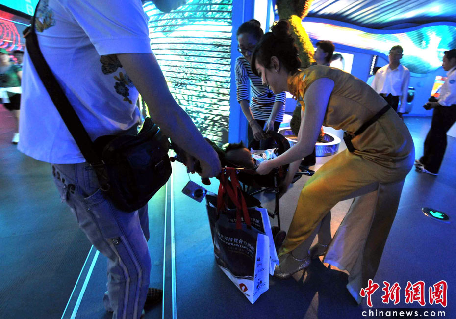 5月3日,上海世博會中國山東館一位禮儀小姐始終笑容可掬,許多參觀者都喜歡與外秀內(nèi)慧的她拍一張留影照。當(dāng)一對夫婦推著嬰兒車經(jīng)過時,她迅速上前幫助抬下階梯。她因而享有全場最善解人意的禮儀小姐美稱。中新社發(fā) 賈國榮 攝