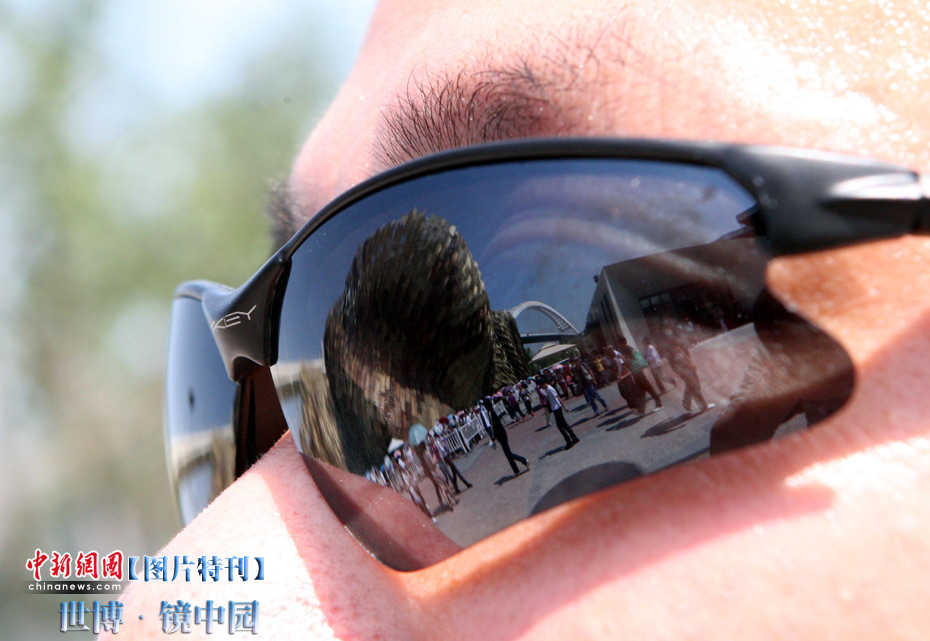 世博園開園3天,天氣一直晴熱,不少游客帶起墨鏡來遮擋刺目的陽光,從鏡片的折射中看世博園,別有一番趣味。中新社記者 湯彥俊攝