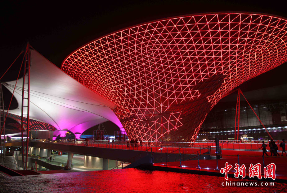 夜幕下的上海世博園區處處流露光華與璀璨,世博軸上的“陽光谷”成為一個個流光溢彩的“夜光杯”,以不同色調交織成流動的光影旋律,給游客們帶來難以忘懷的感受。中新社發 宗金柱 攝
