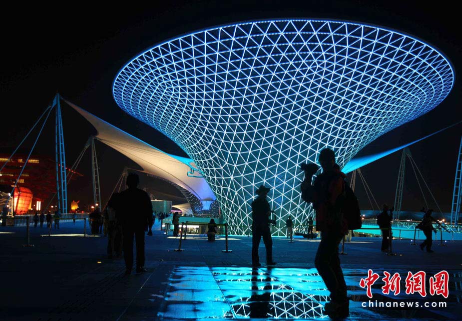 夜幕下的上海世博園區(qū)處處流露光華與璀璨,世博軸上的“陽光谷”成為一個個流光溢彩的“夜光杯”,以不同色調交織成流動的光影旋律,給游客們帶來難以忘懷的感受。中新社發(fā) 宗金柱 攝
