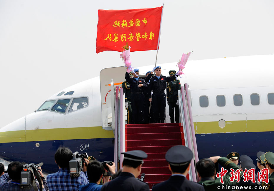 5月4日,中國第八支赴海地維和警察防暴隊全體隊員乘坐聯合國包機返回祖國。公安部副部長孟宏偉、政治部主任蔡安季前往機場迎接。 中新社發 劉震 攝