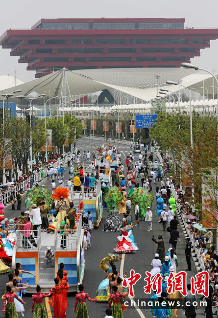 5月4日,世博會北京周花車巡游隊伍向中國館行進(jìn)。當(dāng)日,世博會北京周開幕。 中新社發(fā) 蘇丹 攝