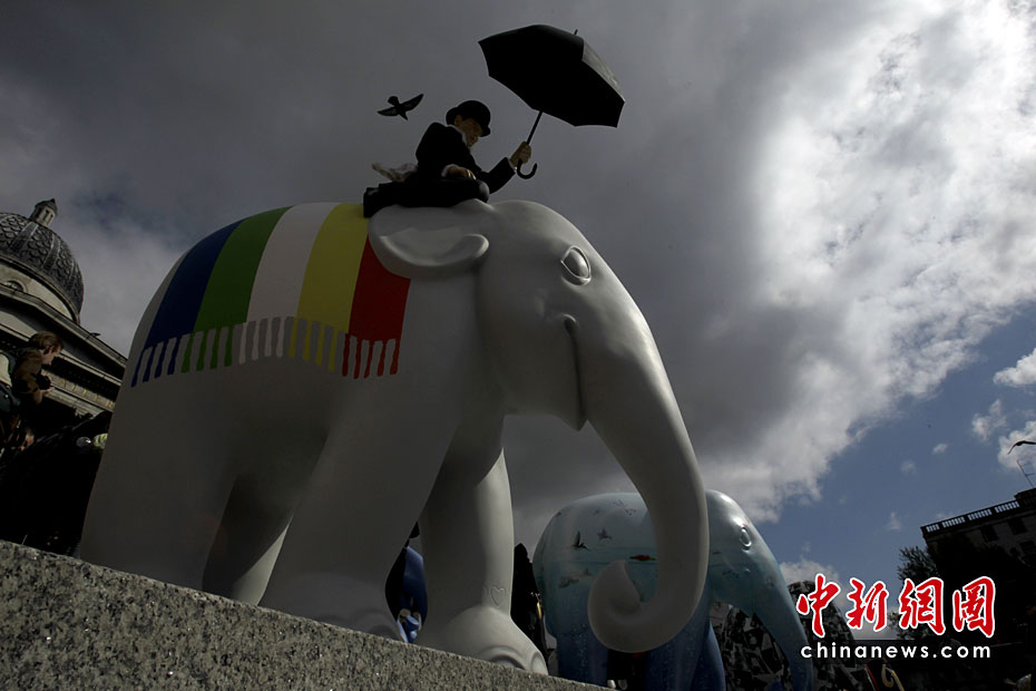 5月4日,2010年倫敦大象游行活動當日在特拉法爾加廣場啟動。260個真象大小的彩繪雕塑將在倫敦各處展出,并將于6月30日拍賣為慈善組織籌款。圖片來源:中國新聞網