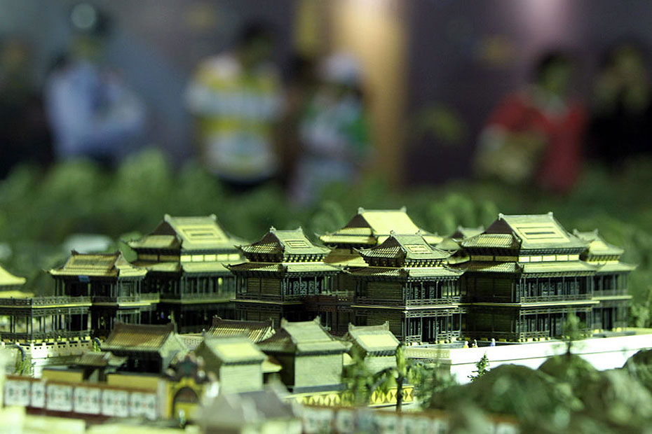 5月4日,游客在參觀縮微版“圓明園”。近日,一座“全景式巨型立雕圓明園”在上海世博會世界貿(mào)易中心協(xié)會館亮相。這座縮微版的“圓明園”以1比150的比例制作而成,再現(xiàn)了全盛時(shí)期的圓明園雄偉壯觀的全景。圖片來源:新華網(wǎng) 裴鑫 攝