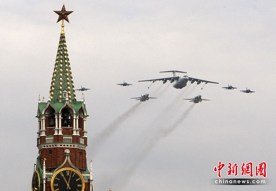 當地時間5月4日,在俄羅斯首都莫斯科,參加彩排的戰機編隊飛過紅場上空。俄羅斯將于5月9日隆重紀念衛國戰爭勝利65周年。圖片來源:中國新聞網