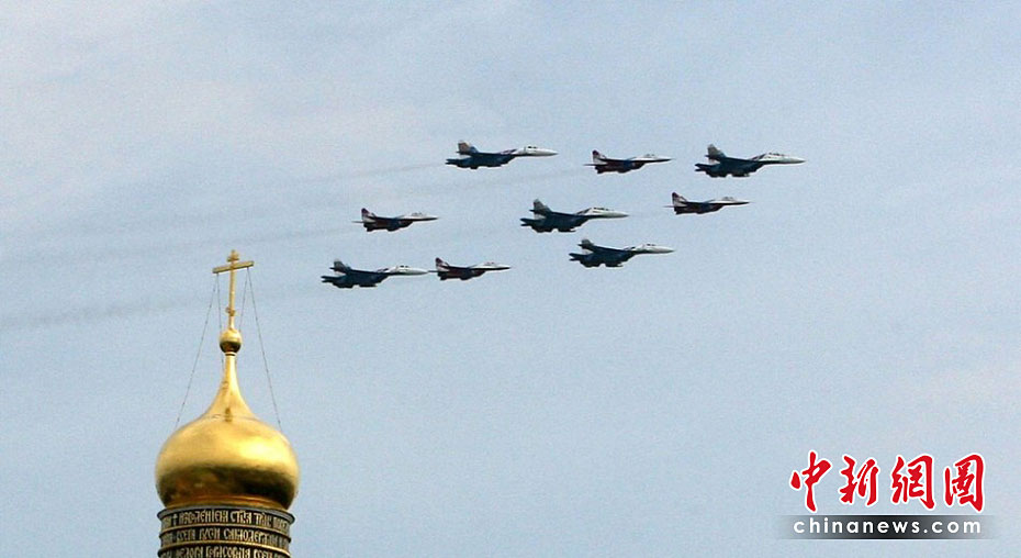 當地時間5月4日,在俄羅斯首都莫斯科,參加彩排的戰機編隊飛過紅場上空。俄羅斯將于5月9日隆重紀念衛國戰爭勝利65周年。圖片來源:中國新聞網