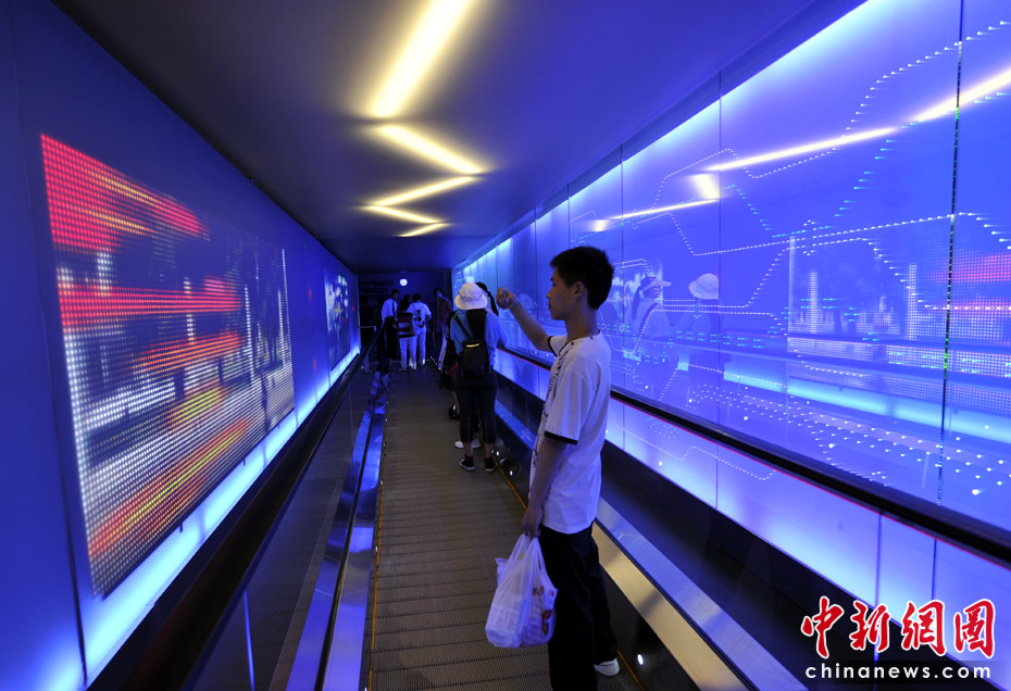 進入互動區的滾梯兩側是炫麗的屏幕,頭頂上方還不時滑過一道道“閃電”。中新網記者 王紅綱 攝