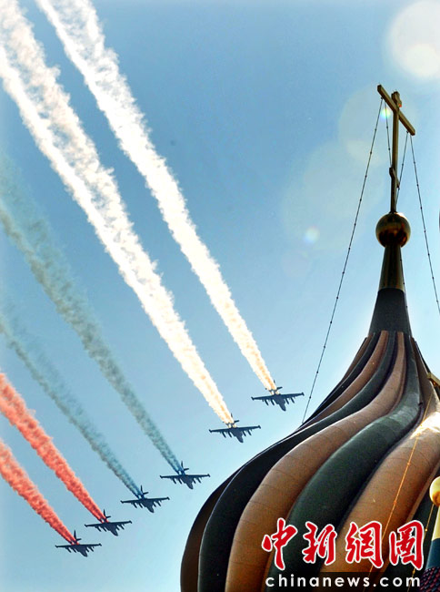 5月9日,俄羅斯在莫斯科紅場舉行盛大的閱兵式,慶祝衛國戰爭勝利65周年。莫斯科時間5月9日上午10點(北京時間9日下午2點)許,閱兵式正式開始。圖為空中梯隊飛越紅場上空。
