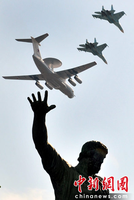 5月9日,俄羅斯在莫斯科紅場舉行盛大的閱兵式,慶祝衛國戰爭勝利65周年。莫斯科時間5月9日上午10點(北京時間9日下午2點)許,閱兵式正式開始。圖為空中梯隊飛越紅場上空。