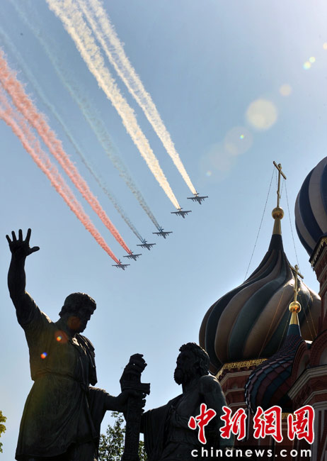 5月9日,俄羅斯在莫斯科紅場(chǎng)舉行盛大的閱兵式,慶祝衛(wèi)國(guó)戰(zhàn)爭(zhēng)勝利65周年。莫斯科時(shí)間5月9日上午10點(diǎn)(北京時(shí)間9日下午2點(diǎn))許,閱兵式正式開(kāi)始。圖為空中梯隊(duì)飛越紅場(chǎng)上空。