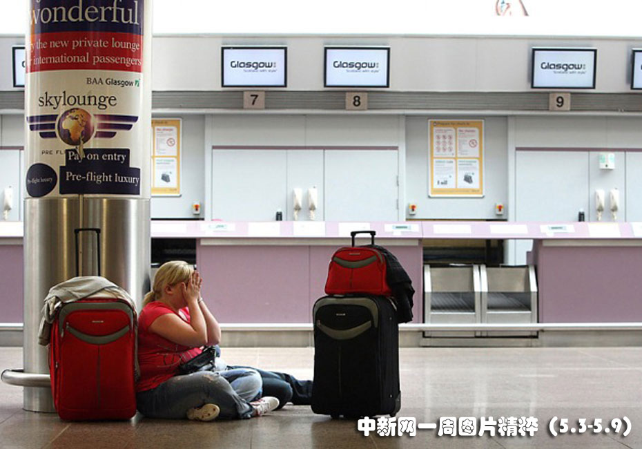 5月5日周三,在格拉斯哥機場,由于冰島新一波濃密火山灰導致航班取消,一名女士沮喪地用手遮住臉。愛爾蘭和蘇格蘭的空中交通均受到影響,英格蘭則僥幸未受波及。