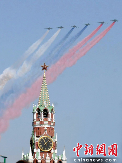 5月9日,俄羅斯在莫斯科紅場舉行盛大的閱兵式,慶祝衛國戰爭勝利65周年。莫斯科時間5月9日上午10點(北京時間9日下午2點)許,閱兵式正式開始。6架蘇-25強擊機在紅場上空噴出象征俄羅斯國旗白、藍、紅三色的煙霧。中新社發 田冰 攝