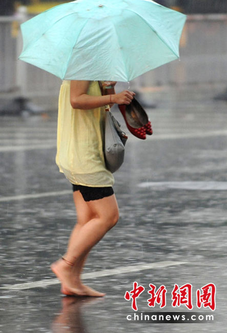 未來三天,青藏高原中東部、西南地區(qū)、江漢、江淮、江南、華南等地將持續(xù)陰雨天氣,其中,廣西南部、廣東大部、江西南部、福建南部、海南西北部、湖北大部、湖南北部、重慶大部等地有大雨或暴雨,局地有大暴雨。圖為5月9日傍晚,佛山市禪城區(qū)文華北路,一個(gè)女孩光著腳在雨中前行。崔景印 攝