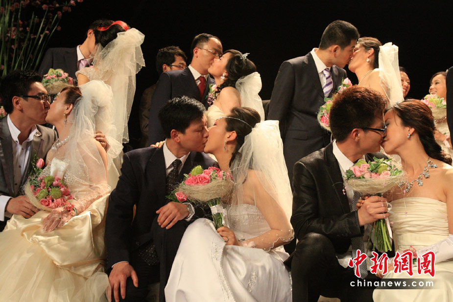 5月11日,35對新人來到世博法國館內(nèi)舉行婚禮儀式。法國館舉行“法蘭西浪漫婚典”的集體婚禮。中新社發(fā) 潘索菲 攝