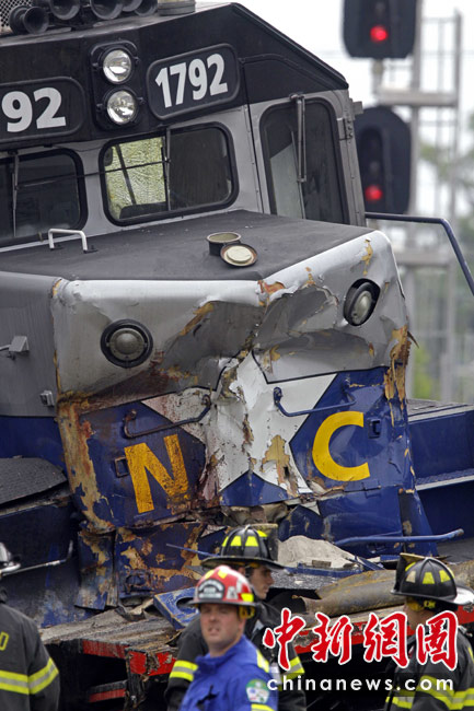 美國北卡羅來納州一列載有36人的通勤列車13日發生脫軌事故,造成至少13人受傷,火車頭和一節車廂起火。圖片來源:中國新聞網