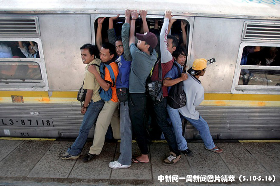 周二(11日),在印度尼西亞雅加達火車站,人們奮力擠入擁擠的市郊火車。